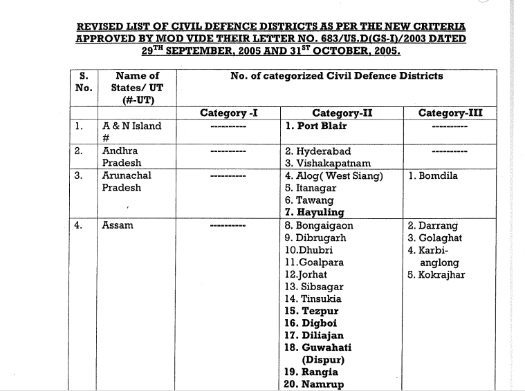 PDF structured in a table format, showing state/UT names and their categorized Civil Defence Districts: