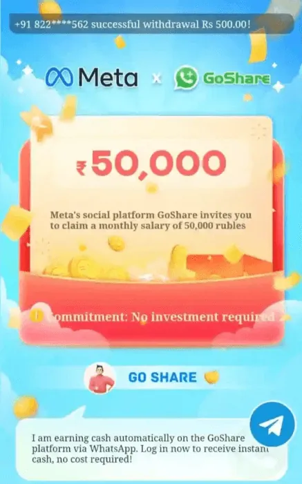 Go Share एक नया ऐप है जिसे Meta और WhatsApp ने मिलकर लॉन्च किया है। इस ऐप के जरिए आपको पैसे कमाने का शानदार अवसर मिलता है। Go Share का उपयोग करके आप आसानी से हर महीने ₹50,000 तक कमा सकते हैं।