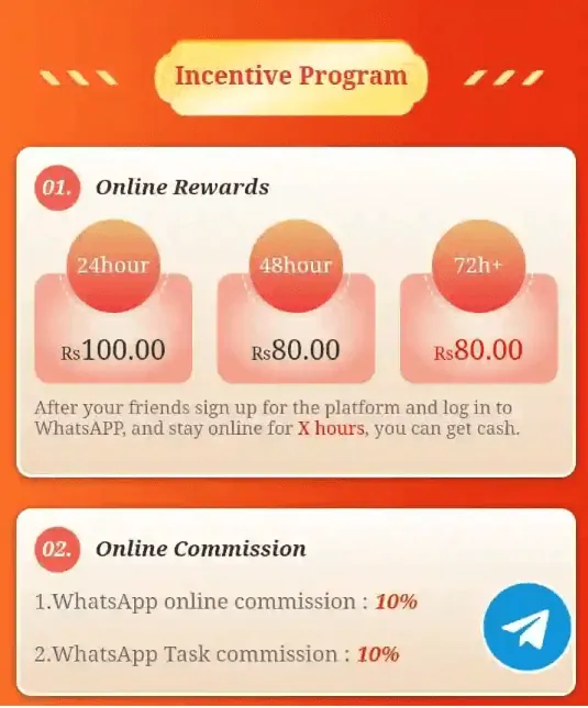 इस ऐप में जब आप WhatsApp, Facebook, या Instagram अकाउंट जोड़कर एक्टिव रहते हैं, तो आपको रिवॉर्ड मिलता है। 24 घंटे एक्टिव रहने पर ₹100 मिलते हैं, 48 घंटे एक्टिव रहने पर ₹80 और 72 घंटे एक्टिव रहने पर ₹80 और मिलते हैं। इसके अलावा, अगर आपके रेफर कोड से कोई दोस्त एक्टिव रहता है, तो उसका 10% रिवॉर्ड भी आपको मिलता है।