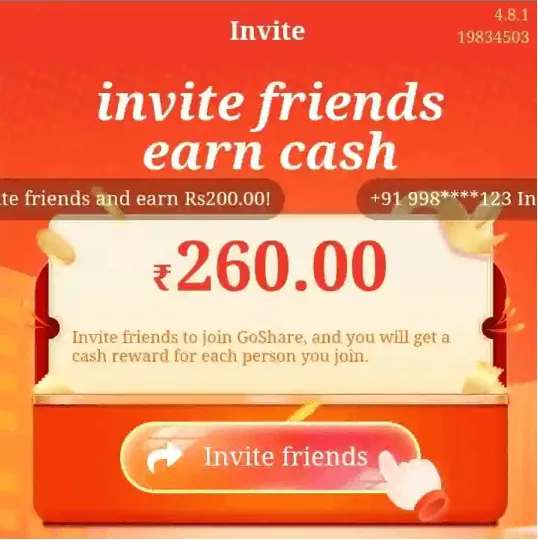 Go Share ऐप पर पैसे कमाने का एक बेहतरीन तरीका है रेफरल प्रोग्राम। जब आप किसी को इस ऐप से जोड़ने के लिए रेफर करते हैं और वह आपके लिंक से ऐप डाउनलोड करता है, तो आपको ₹260 मिलते हैं। इसके अलावा, जब वह व्यक्ति एक्टिव रहता है, तो आपको 10% कमीशन मिलता है। इस तरीके से आप अपने नेटवर्क को बढ़ाकर आसानी से पैसे कमा सकते हैं।