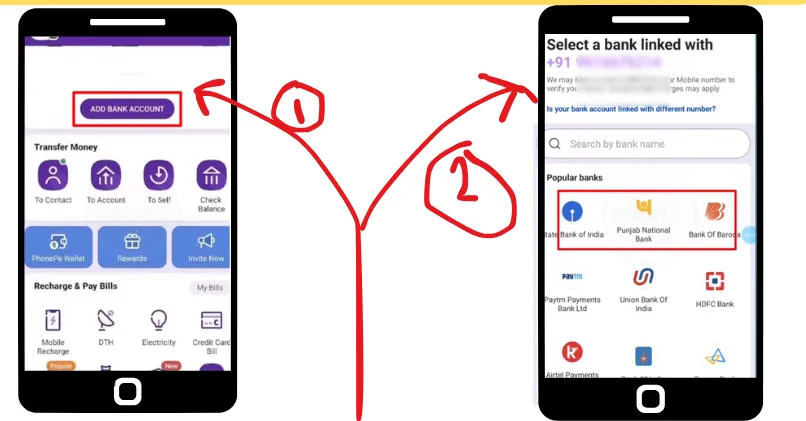 फोनपे से लेन-देन करने के लिए आपको यूपीआई आईडी को बनाना पड़ेगा उसके लिए ADD BANK ACCOUNT पर क्लिक कर अपने बैंक अकाउंट को Select करें। जैसे की इमेज में दिखाया गया हैं।