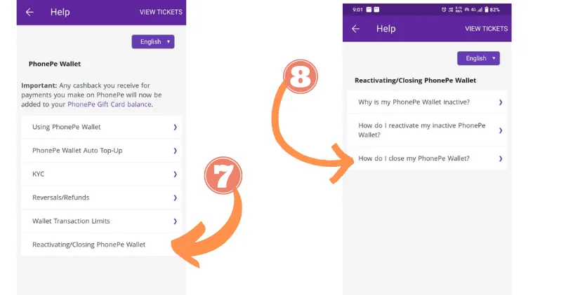 स्टेप 4: अब आपको 6 ऑप्शन दिखाई देगा जिनमे से सबसे निचे वाले ऑप्शन “Reactivating/Closing PhonePe Wallet” पर क्लिक कर अगले पेज पर जाना हैं। वहां सबसे निचे वाले ऑप्शन “How do I close my PhonePe Wallet?” पर क्लिक कर ओपन कर लीजिये।