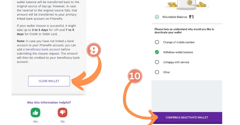स्टेप 5: इस फाइनल स्टेप में आपको PhonePe वॉलेट Close करने के बारे में बताया गया हैं। उसे पढ़े और निचे की ओर स्क्रॉल करके सबसे अंत में आइये वहां आपको “CLOSE WALLET” का बॉटम दिखाई देगा उसे क्लिक करें उनके बाद दूसरे वाले ऑप्शन “Withdraw wallet balance” पर टिक करके “CONFIRM & DEACTIVATE WALLET” पर क्लिक करें आपका पूरा पैसा आपके बैंक अकाउंट में वापस मिल जायेगा।