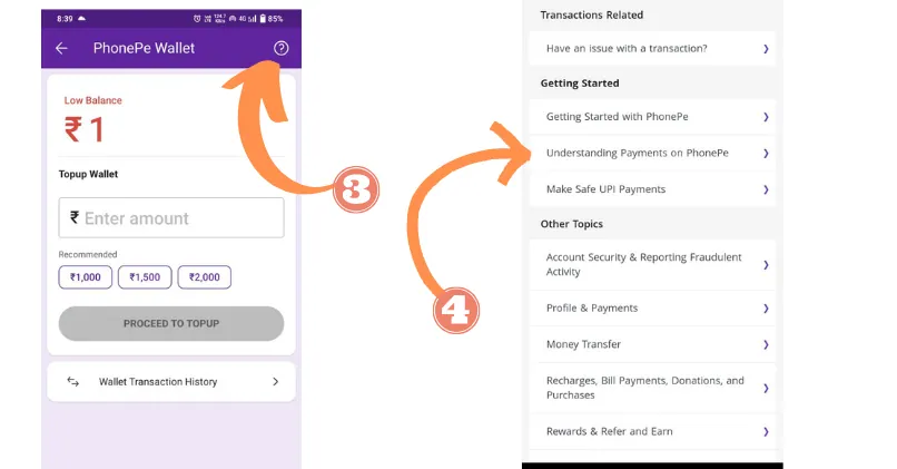 स्टेप 2: अब आपको सबसे ऊपर Right में Question Mark “❔” का आइकॉन दिखाई दे रहा होगा उसे क्लिक कर ओपन कीजिये। उसके बाद बहुत सारे टॉपिक दिखाई देगा जिनमे से “Understanding Payments on PhonePe” वाले पर क्लिक कीजिये।