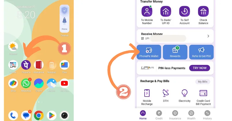 स्टेप 1: सबसे पहले आपको अपने मोबाइल में PhonePe App को खोलना होगा उसके बाद UPI Lite सेक्शन के ऊपर “PhonePe Wallet” दिखाई दे रहा होगा। उस पर क्लिक कर उसे ओपन कीजिये। यदि नहीं समझ आ रहा हैं तो इस फोटो को देख सकते हैं।