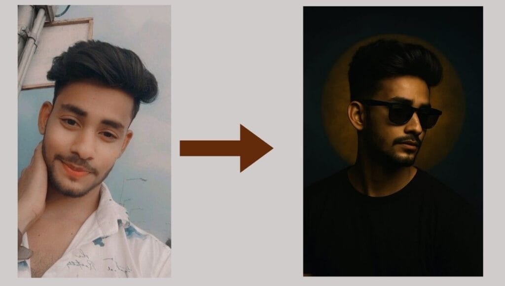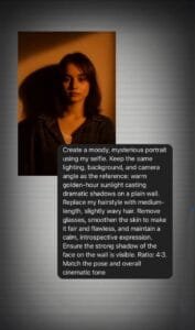 Prompt:- Create a moody, mysterious portrait using my selfie. Keep the same lighting, background, and camera angle as the reference: warm golden-hour sunlight casting dramatic shadows on a plain wall.