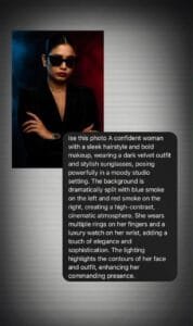 Prompt: - Convert this Photo into a confident woman with a sleek hairstyle and bold makeup, wearing a dark velvet outfit and stylish sunglasses, posing powerfully in a moody studio setting. The background is dramatically split with blue smoke on the left and red smoke on the right, creating a high-contrast, cinematic atmosphere. She wears multiple rings on her fingers and a luxury watch on her wrist, adding a touch of elegance and sophistication. The lighting highlights the contours of her face and outfit, enhancing her commanding presence.