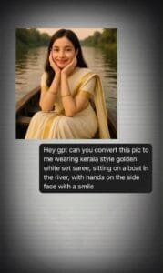 Prompt:- Hey gpt can you convert this pic to me wearing kerala style golden white set saree, sitting on a boat in the river, with hands on the side face with a smile